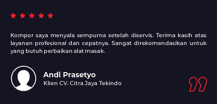 Kami memahami pentingnya fungsi peralatan dapur dalam aktivitas harian Anda. Oleh karena itu, kami berkomitmen memberikan solusi terbaik melalui layanan berkualitas dan spare part original. Kepercayaan pelanggan menjadi prioritas utama kami, dan kami terus berinovasi untuk menjawab kebutuhan servis yang andal dan memuaskan di berbagai wilayah layanan kami.